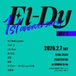 ■ イベント名El-Dy 1st anniversaryDAY 1 ■ 開催日2026年2月7日(土) ■ 時間14:00 – 20:00 ■ 料金2,500円(1D) ■ 会場SENDAI El-Dy宮城県仙台市青葉区一番町1-11-20SUGA-DUNE一番町 4F ■ DJDJ N …